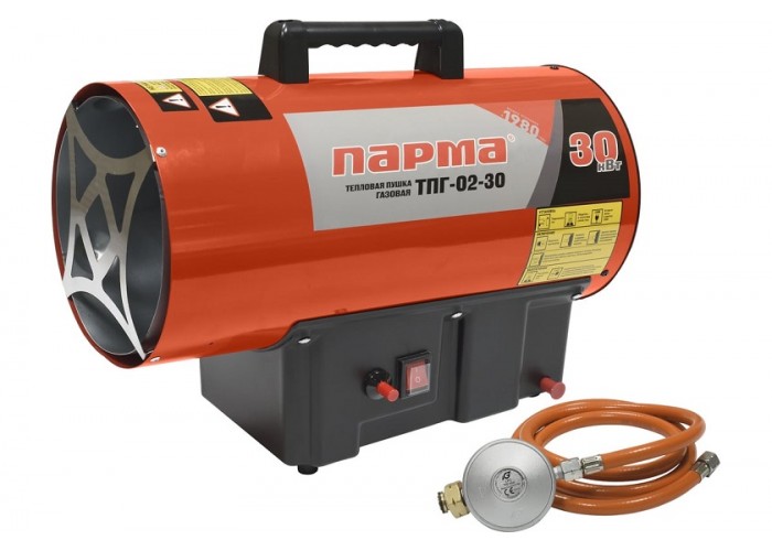 Газовая пушка Парма ТПГ-02-30 – воздухонагреватель прямого нагрева, работающий на газовом топливе. Топливо необходимо для получения горячей атмосферы в камере сгорания, а электроэнергия, подводимая к устройству, необходима для питания вентилятора, нагнетающего воздух, и для функционирования автоматики. Газовая пушка является простой и надежной конструкцией без дымохода, но горячий воздух и продукты сгорания из устройства поступают в помещение.