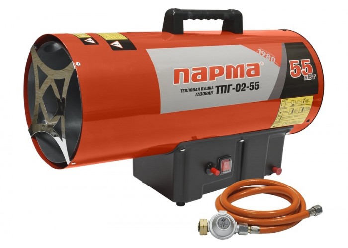 Газовая пушка Парма ТПГ-02-55 – воздухонагреватель прямого нагрева, работающий на газовом топливе. Топливо необходимо для получения горячей атмосферы в камере сгорания, а электроэнергия, подводимая к устройству, необходима для питания вентилятора, нагнетающего воздух, и для функционирования автоматики. Газовая пушка является простой и надежной конструкцией без дымохода, но горячий воздух и продукты сгорания из устройства поступают в помещение.
