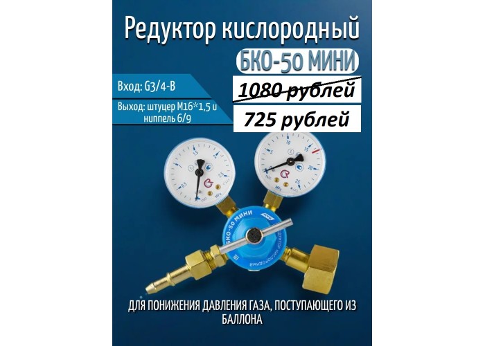 Редуктор кислородный БКО-50 МИНИ предназначен для понижения давления газа, поступающего из баллона, и автоматического поддержания постоянным заданного рабочего давления при газопламенной обработке. Производит тонкую настройку рабочего давления, особенно на малых величинах. Срабатывание предохранительного клапана происходит при давлении в 1,6 МПа.